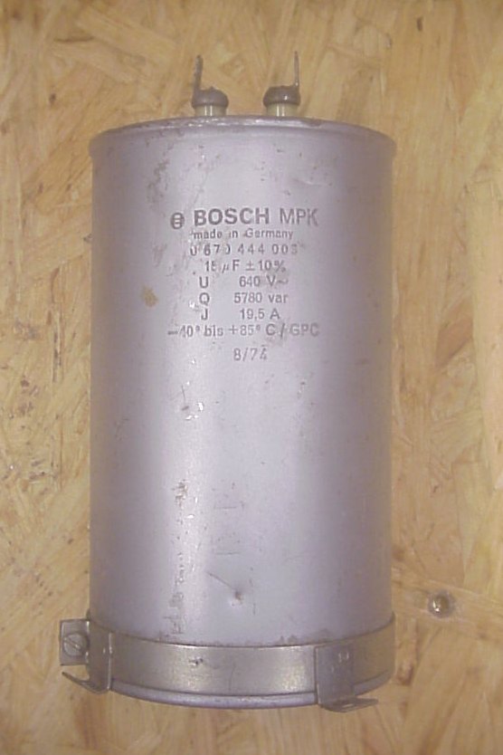 KONB15642 | Bosch 15uF 640 VAC = 2kVDC, die Oberklasse unter den Leistungskondensatoren. Ausbau, geprüft 90*150 | Bosch MP 15 MFD 640 VAC = 2kVDC, this is the upperclass of the Bosch MPs, grey painted steel can, tested OK, made around 1970, a true vintage capacitor !!! 90*150 mm diameter times height. | Bosch MP 15uF 640 VCA = 2kVCD. Occasion testé. Condesateur à qualité superieure. Fabriqué environ 1970. Boite acier gris. | 22,90 | 26,56 | Robert Bosch GmbH Robert-Bosch-Platz 1 70839 Gerlingen kontakt@bosch.de |